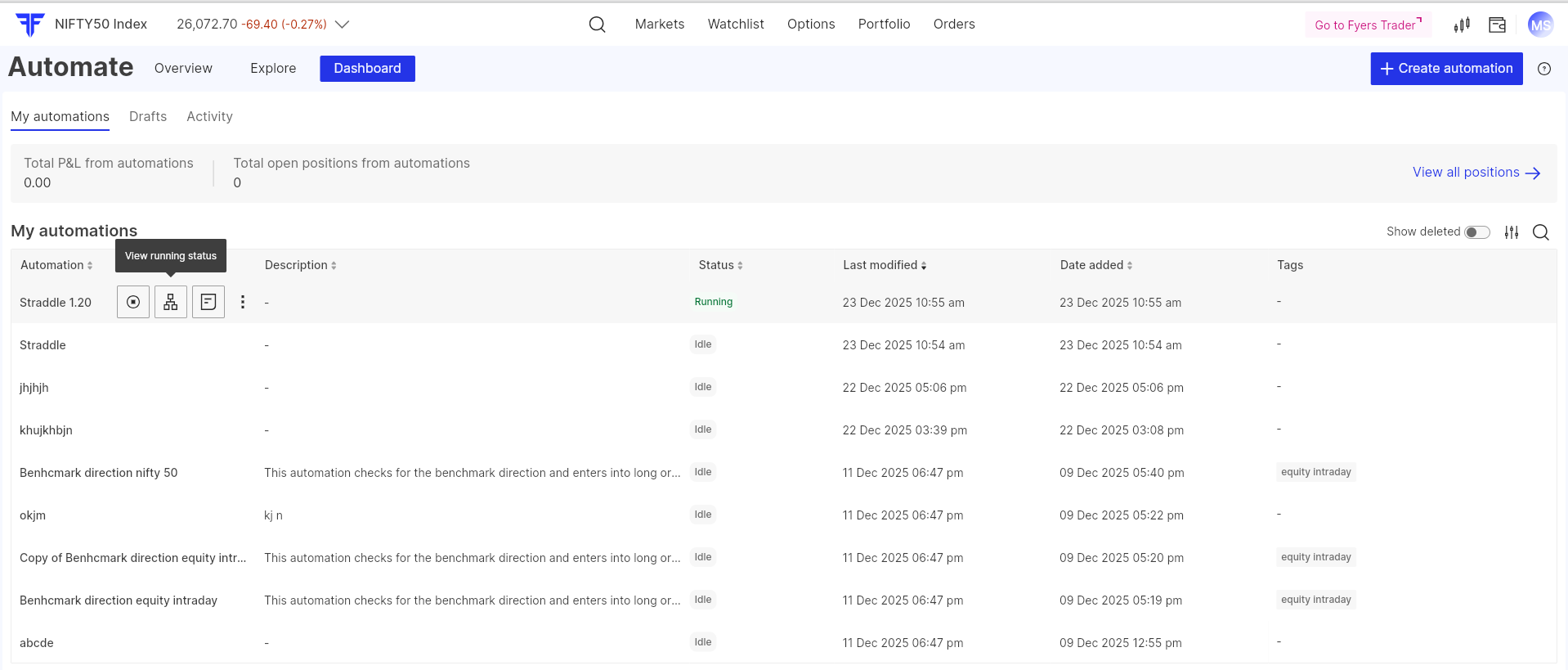 You can start an automation from the canvas after it passes validation. The screenshots you shared show the three stages: building the flow, saving to validate, and (post-validation) the Run now button. FYERS Web Build your workflow on the canvas ...
