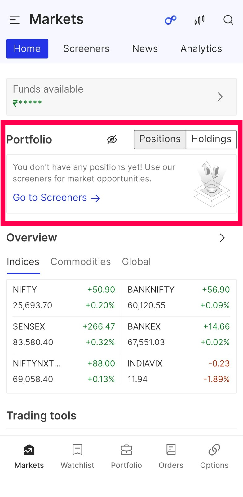 - Log in to FYERS and go to Markets (the Home view opens by default).