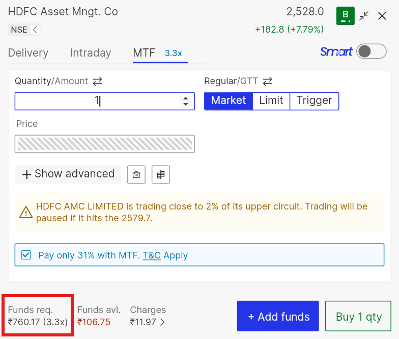 On the buy screen, FYERS shows the leverage, Funds required, and the percentage you need to pay, such as Pay only 31% with MTF.