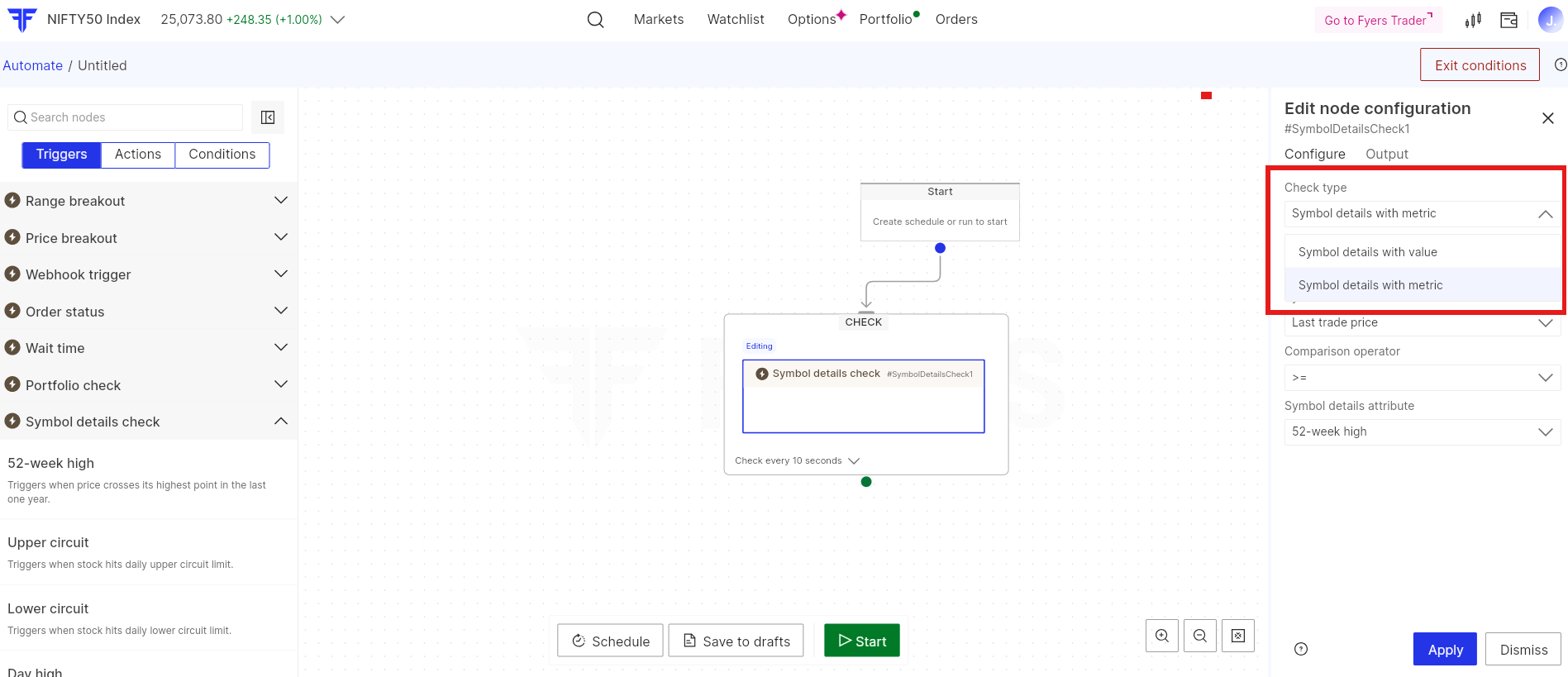 Symbol details checks are configured on the canvas by selecting the check type, choosing whether to compare against a value or a metric, selecting the symbol, and defining the comparison condition. Once the selected condition is met, the automation proceeds to the next connected node.