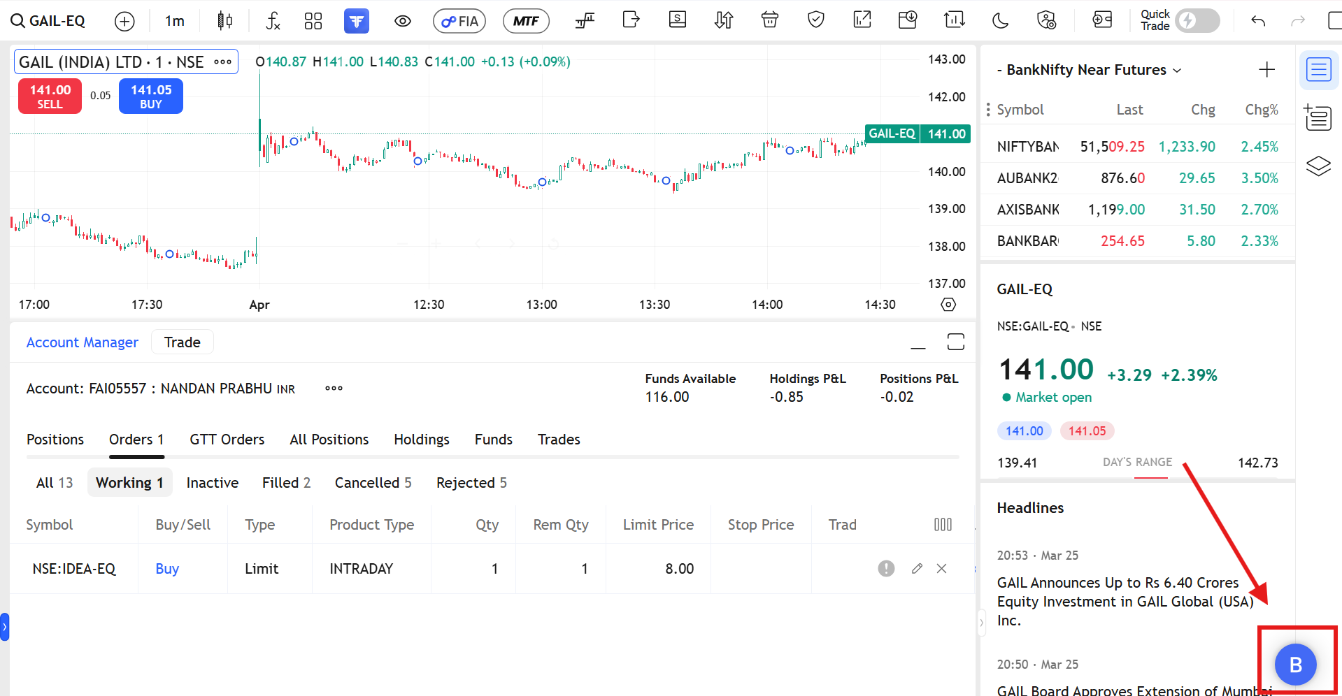 Later, when clicked on the blue icon, the order panel of GAIL will pop up with the same modifications made earlier.