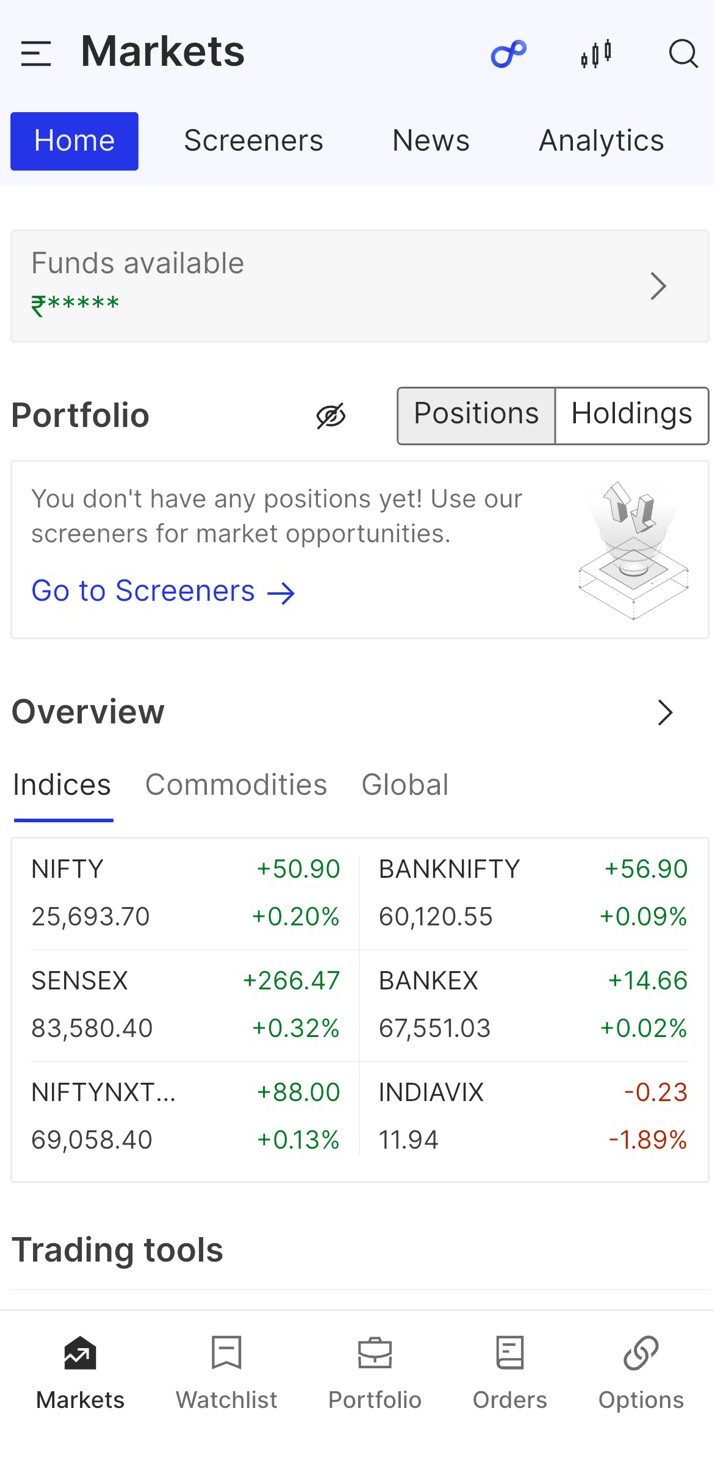 - Trading tools: Charts/Advance charts, Strategy builder (App), Option scalper terminal (Web), F&O dashboard (App), Pay later (MTF), Alerts, Baskets, Pledge.