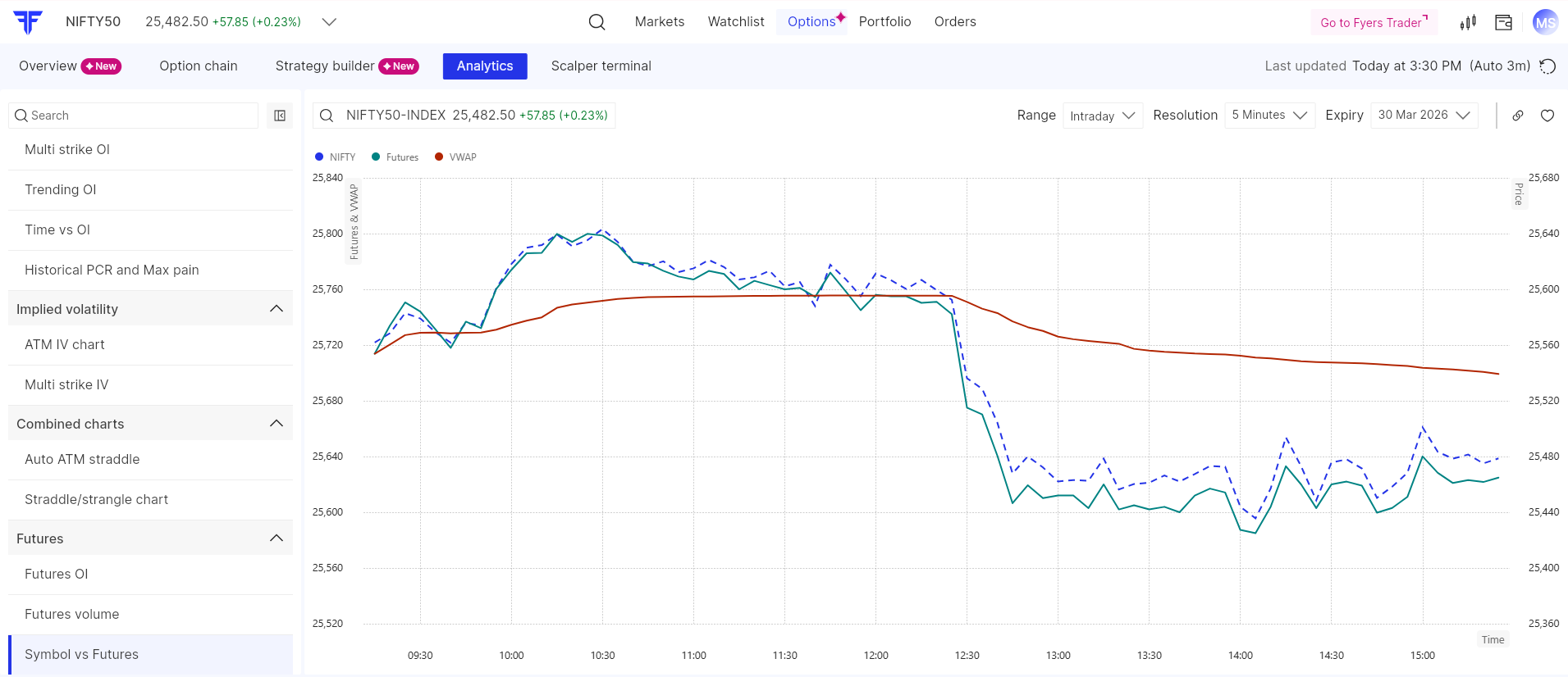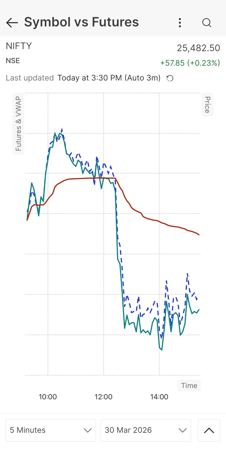The traded price of the selected futures contract for the same underlying and expiry. - VWAP (Volume Weighted Average Price)