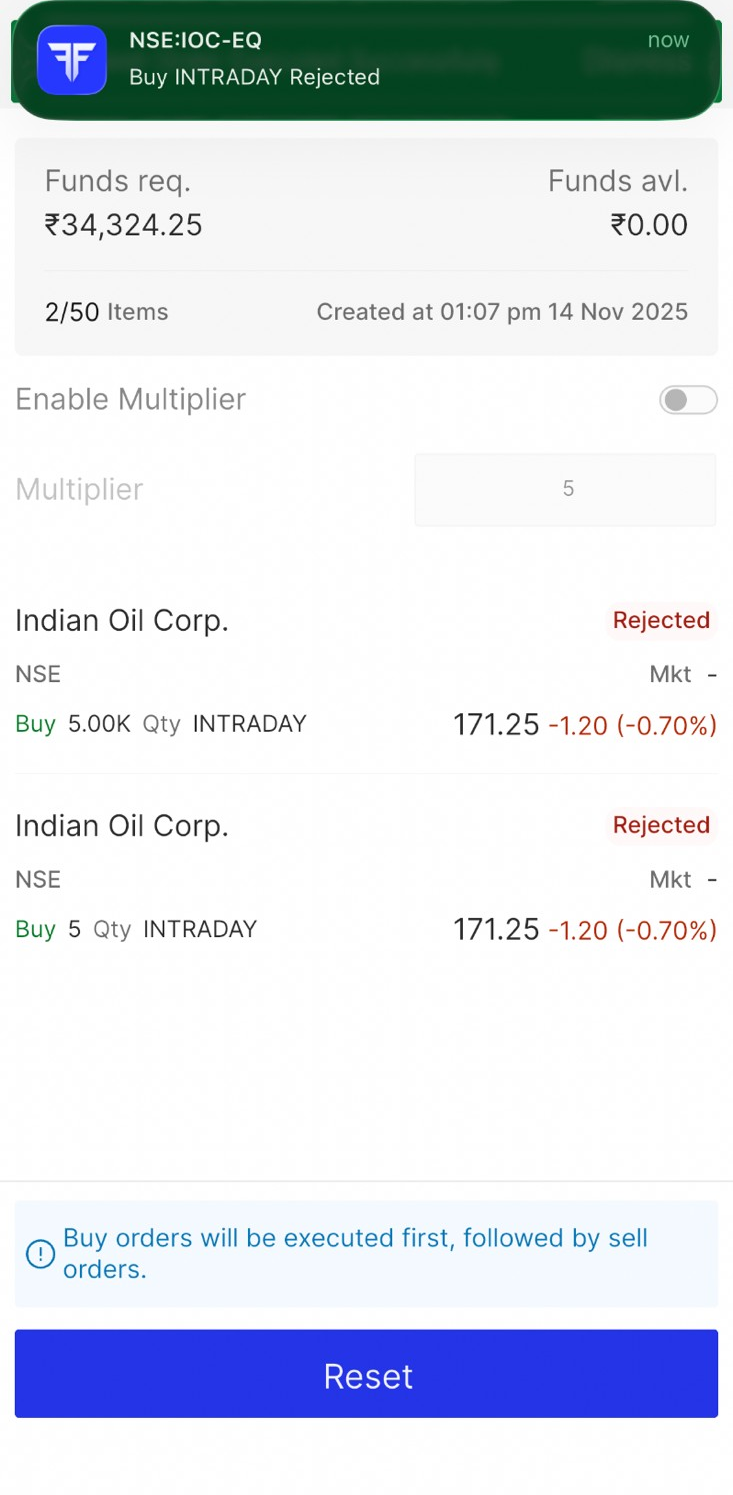 On the FYERS App, the execution status appears on the same basket screen immediately after you tap Execute. You will see item-wise updates and badges such as Rejected &Successful. This view remains visible until you tap Reset.
